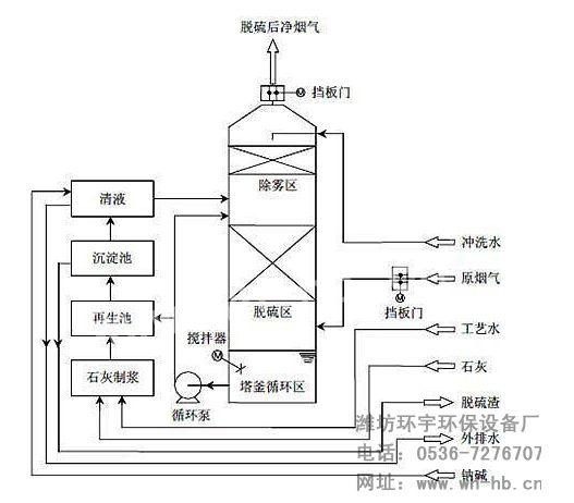 基本原理:將配制好的氫氧化鈉溶液泵入脫硫塔,吸收煙氣中SO2,脫硫產(chǎn)物排出脫硫塔外,再由再生池內(nèi)的石灰漿液還原成氫氧化鈉再打回脫硫塔內(nèi)循環(huán)使用。